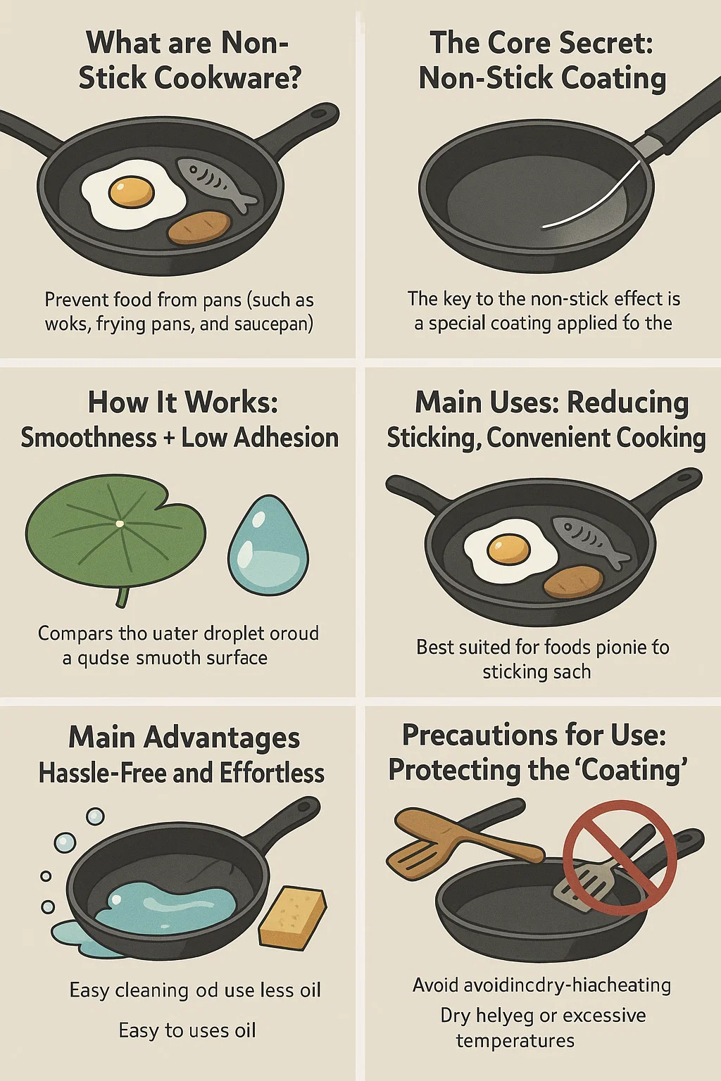 Ringkasnya, mereka adalah periuk dan kuali (seperti kuali, kuali, dan saucepans) yang permukaan dalamannya telah dirawat khas untuk mencegah makanan dari melekat ke bawah semasa memasak. Apabila anda menggerakkan goreng, goreng telur, atau ikan goreng, makanan tidak akan mudah melekat ke bahagian bawah kuali.