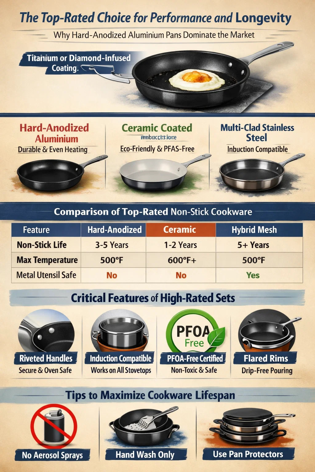Penarafan tertinggi alat memasak tidak melekat yang kini mendominasi pasaran ialah Kuali Aluminium Beranod Keras , khususnya model yang menampilkan salutan bertetulang berbilang lapisan. Cef profesional dan tukang masak rumah secara konsisten meletakkan set ini tertinggi kerana mereka merapatkan jurang antara pelepasan makanan yang mudah dan ketahanan lasak. Jenama yang menggunakan permukaan bertetulang titanium atau berlian menerima markah tertinggi untuk menahan calar dan mengekalkan kelicinan selama lebih 5 tahun penggunaan harian.